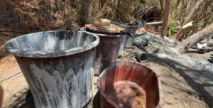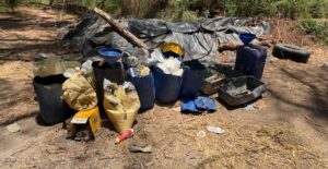 A seis kilómetros de este sitio, hace tres días fue asegurada un área de almacenamiento, con un total de 11 mil 500 litros de diversas sustancias utilizadas para la elaboración del “cristal”.