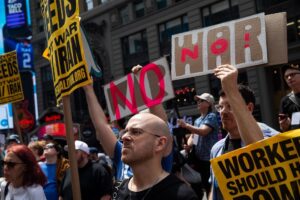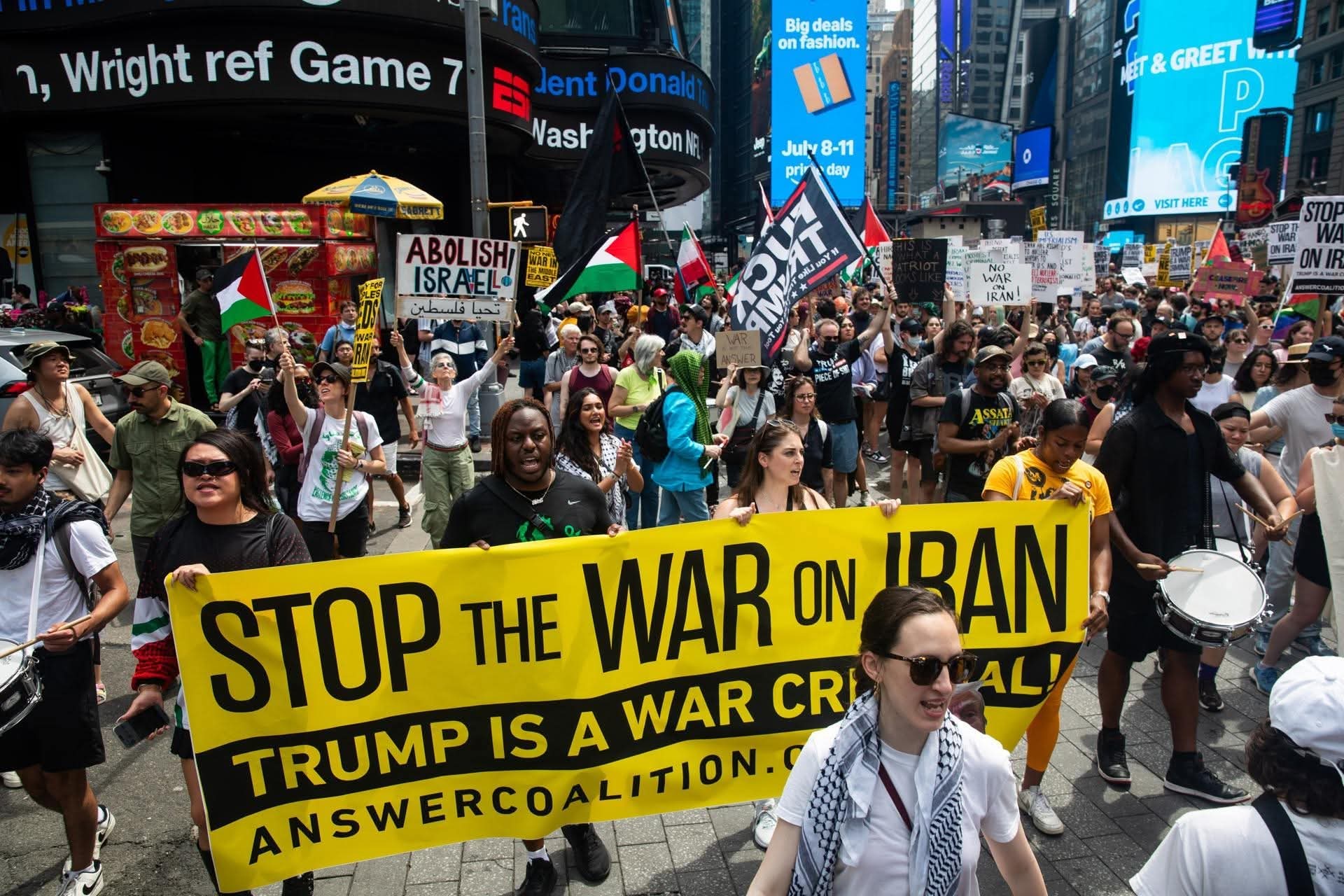 Nueva York, Estados Unidos; a 22 de junio de 2025.- Decenas de personas se congregaron en Times Square, para protestar por los los ataques aéreos realizados por Estados Unidos contra tres instalaciones nucleares en Irán.