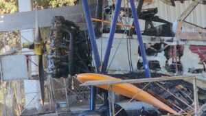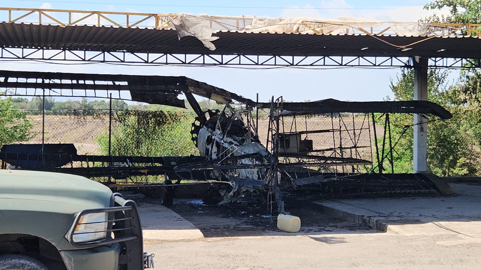 Posteriormente, los atacantes rociaron con combustible un avión ligero que estaba estacionado en el lugar, el cual se incendió por completo y quedó reducido a chatarra, junto con el inmueble.