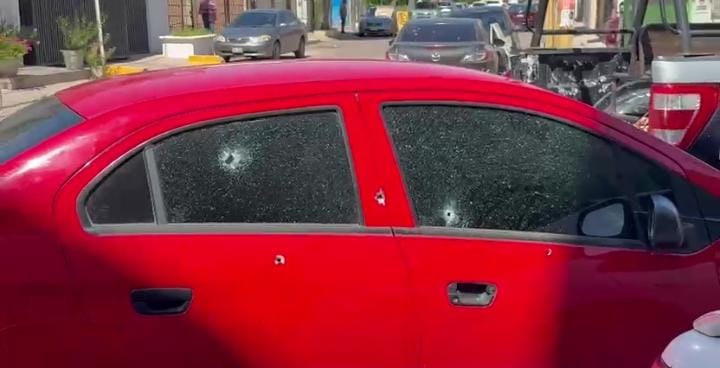 El vehículo tipo sedán, con impactos de arma de fuego en los cristales y puertas del lado del copiloto, quedó asegurado en el sitio donde ocurrió el atentado.