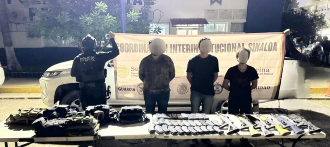 Tras denuncia anónima, el Grupo Interinstitucional asegura, en Culiacán, a 7 civiles con armas largas, cargadores abastecidos, chalecos tácticos, entre otros equipos tácticos ilícitos