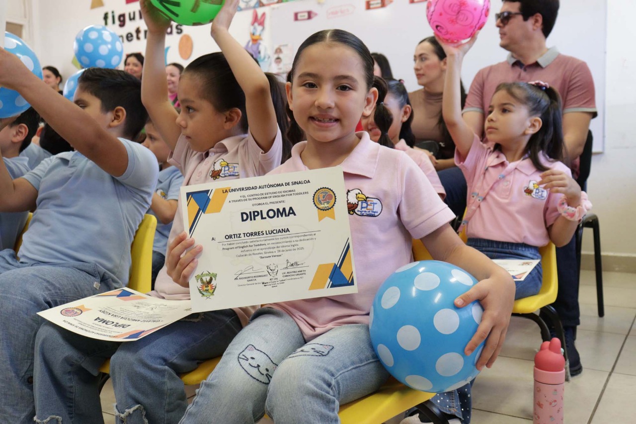 Con bases sólidas de un segundo idioma, 152 niñas y niños culminan su etapa de aprendizaje en el Program of English for Toddlers (PET) del Centro de Estudio de Idiomas (CEI) de la Universidad Autónoma de Sinaloa (UAS), quienes se encuentran listos para incorporarse en el Programa Infantil Sabatino de Inglés (PISI) y continuar su desarrollo académico del idioma inglés.
