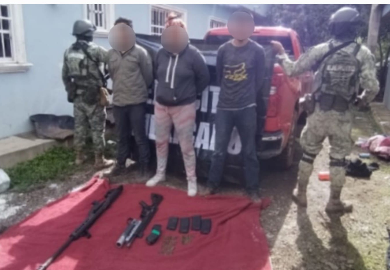 Esta acción se llevó a cabo durante reconocimientos terrestres realizados por elementos militares en el poblado Potrerillos, donde se detuvo a tres civiles, entre ellos una mujer. Además, en el lugar se aseguró lo siguiente: