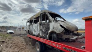 Otro bloqueo se registró sobre la autopista Benito Juárez, en el carril de sur a norte, a la altura de la caseta de cobro de San Blas, en la sindicatura de Villa Ángel Flores, La Palma. En este caso, un vehículo tipo transporte de personal fue atravesado sobre la vialidad e incendiado en su totalidad.