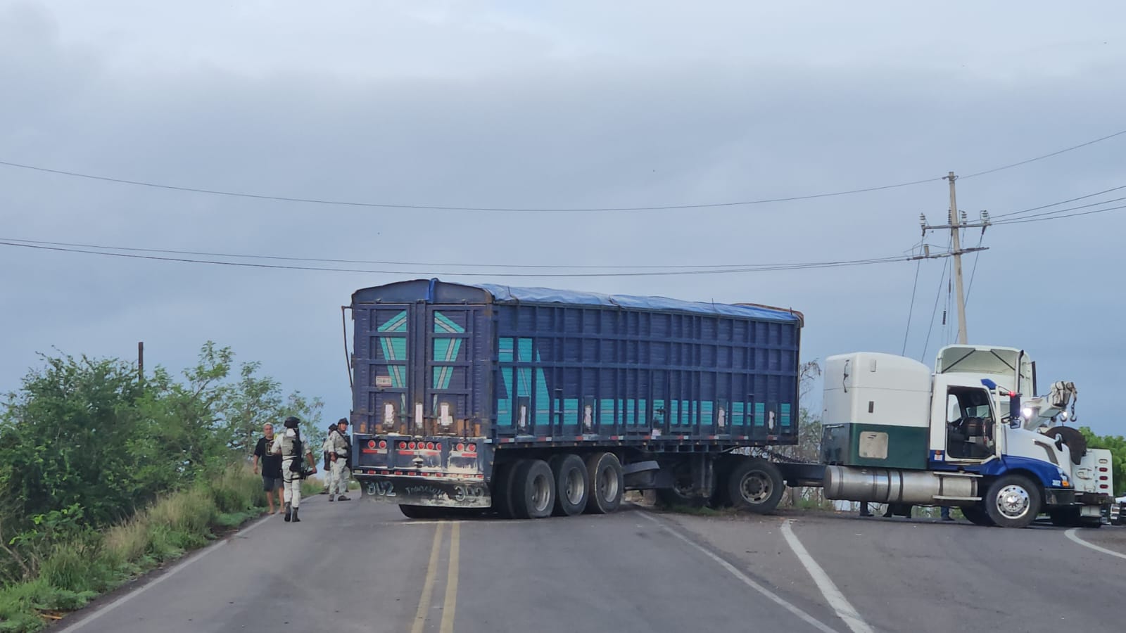 Uno de los bloqueos se registró en la carretera vieja Navolato, a la altura de la autopista Benito Juárez, la costera, donde un tráiler de color blanco con verde y azul fue atravesado en ambos carriles de la carretera, impidiendo el acceso tanto a la carretera vieja como a la autopista.