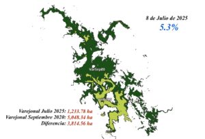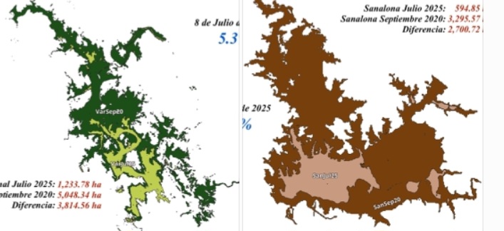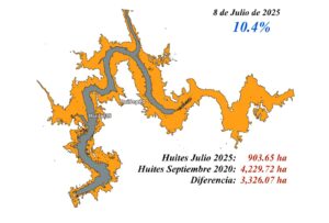 “En septiembre de 2020 fue un buen año de lluvias, las presas estaban bien y en ese comparativo al 08 de julio la presa huites estaba al 10.4 por ciento de su capacidad, que significa eso el color naranja, es el color del 2020; así se encontraba la presa y el color gris, es como está ahorita. Como se dan cuenta, el espejo de agua en el 2020 era de 4 mil 229 hectáreas, hoy es de 900, entonces para alcanzar ese espejo de agua ocupamos 3 mil 323 hectáreas, es lo que esperaríamos se llene la presa de aquí a septiembre o a octubre si queremos alcanzar un nivel parecido al 2020”, explicó.