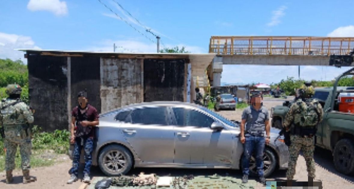 Escuinapa, Sinaloa, a 15 de julio de 2025.- Elementos del Ejército Mexicano, en coordinación con la Guardia Nacional, la Secretaría de Marina, la Secretaría de Seguridad y Protección Ciudadana, detuvieron a dos civiles con armas, municiones, ponchallantas y aseguraron un vehículo en el municipio de Escuinapa.