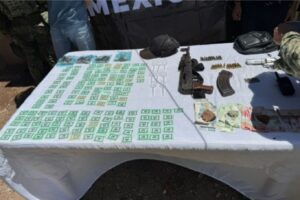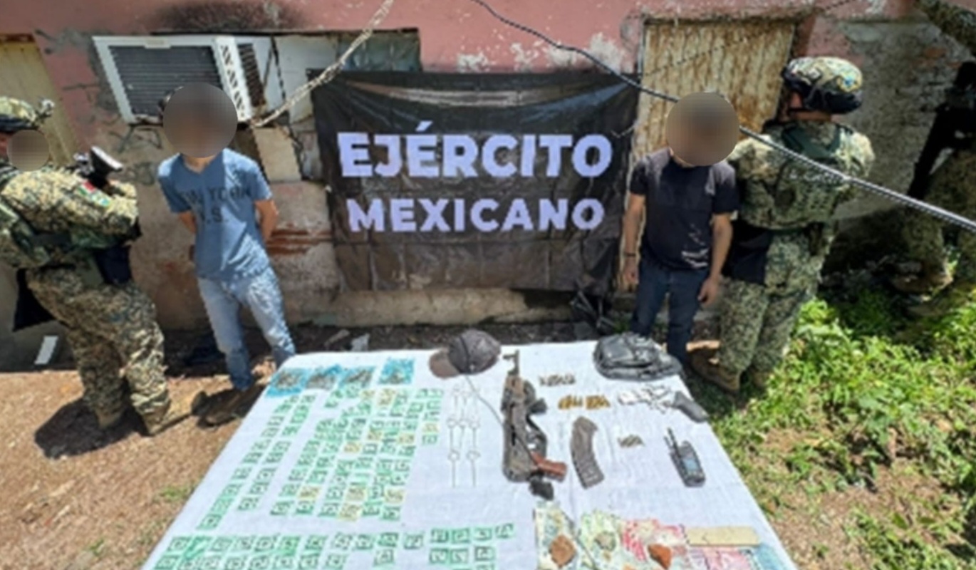 Esta acción se llevó a cabo durante reconocimientos terrestres en la colonia Díaz Ordaz, donde personal militar aseguró a dos civiles, a quienes se les localizó lo siguiente: