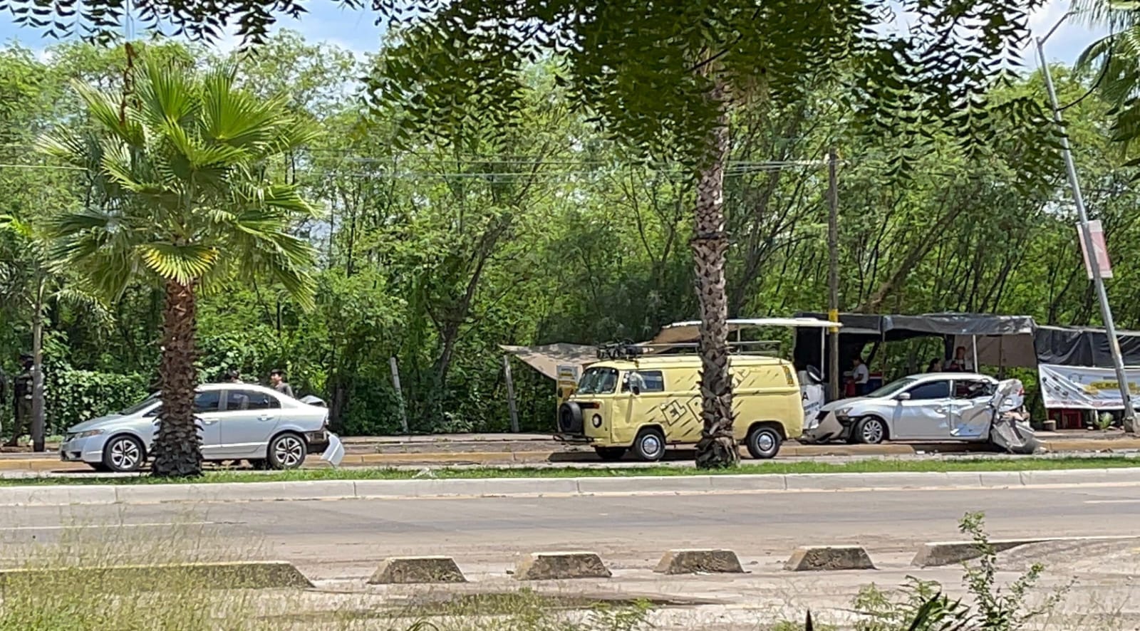 Culiacán, Sinaloa; a 03 de agosto de 2025.- Un vehículo de la Secretaría de la Defensa Nacional chocó contra dos vehículos estacionados, uno de la marca Honda, línea Civic, color gris y otro del mismo color, pero de la marca Nissan, Sentra que se encontraron estacionados en el acotamiento del carril de poniente a oriente de la carretera a Imala a la altura del fraccionamiento Los Ángeles.