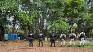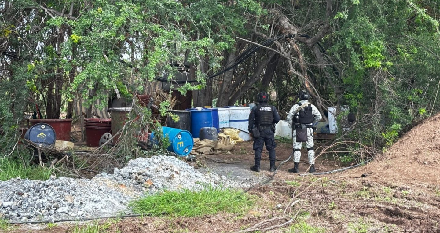 Mocorito, Sinaloa, a 12 de agosto de 2025.- La Secretaría de Seguridad Pública de Sinaloa, a través de la Policía Estatal Preventiva y la Guardia Nacional, en coordinación con elementos del Ejército Mexicano, la Secretaría de Marina, la Secretaría de Seguridad y Protección Ciudadana, la Fiscalía General de la República y la Fiscalía General del Estado, aseguraron un área de concentración de sustancias para la elaboración de drogas en Mocorito.