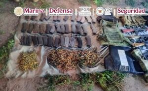 En otra acción, derivado de recorridos terrestres en el poblado Adolfo López Mateos, “Tamarindo”, en Culiacán, personal naval detuvo a una persona, aseguró dos armas largas, 10 cargadores, 300 cartuchos, un casco táctico, dos radios y aproximadamente 119 gramos de polvo blanco similar a la cocaína.