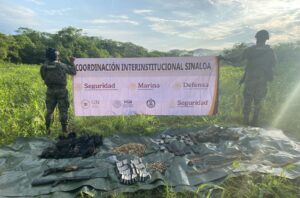 San Ignacio, Sinaloa, a 15 de agosto de 2025.- Elementos de la Secretaría de Marina, en coordinación con el Ejército Mexicano, la Guardia Nacional, la Secretaría de Seguridad y Protección Ciudadana, la Fiscalía General de la República, la Fiscalía General del Estado y la Secretaría de Seguridad Pública del Estado, a través de la Policía Estatal Preventiva, localizaron armas, más de 3 mil cartuchos y otros objetos.