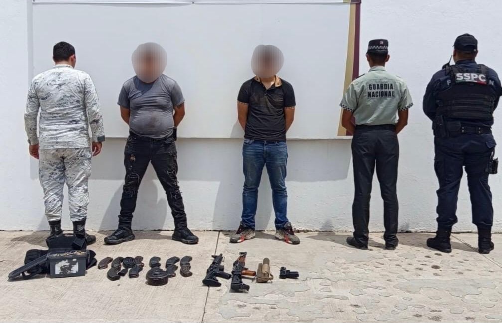 Culiacán, Sinaloa, a 22 de agosto de 2025.- Personal de la Guardia Nacional, en coordinación con el Ejército, la Secretaría de Marina, la Secretaría de Seguridad y Protección Ciudadana, la Fiscalía General de la República, la Fiscalía General del Estado y la Secretaría de Seguridad Pública Estatal, a través de la Policía Estatal Preventiva, detuvieron a dos civiles a quienes les aseguraron armamento, municiones, una motocicleta y un vehículo con reporte de robo.