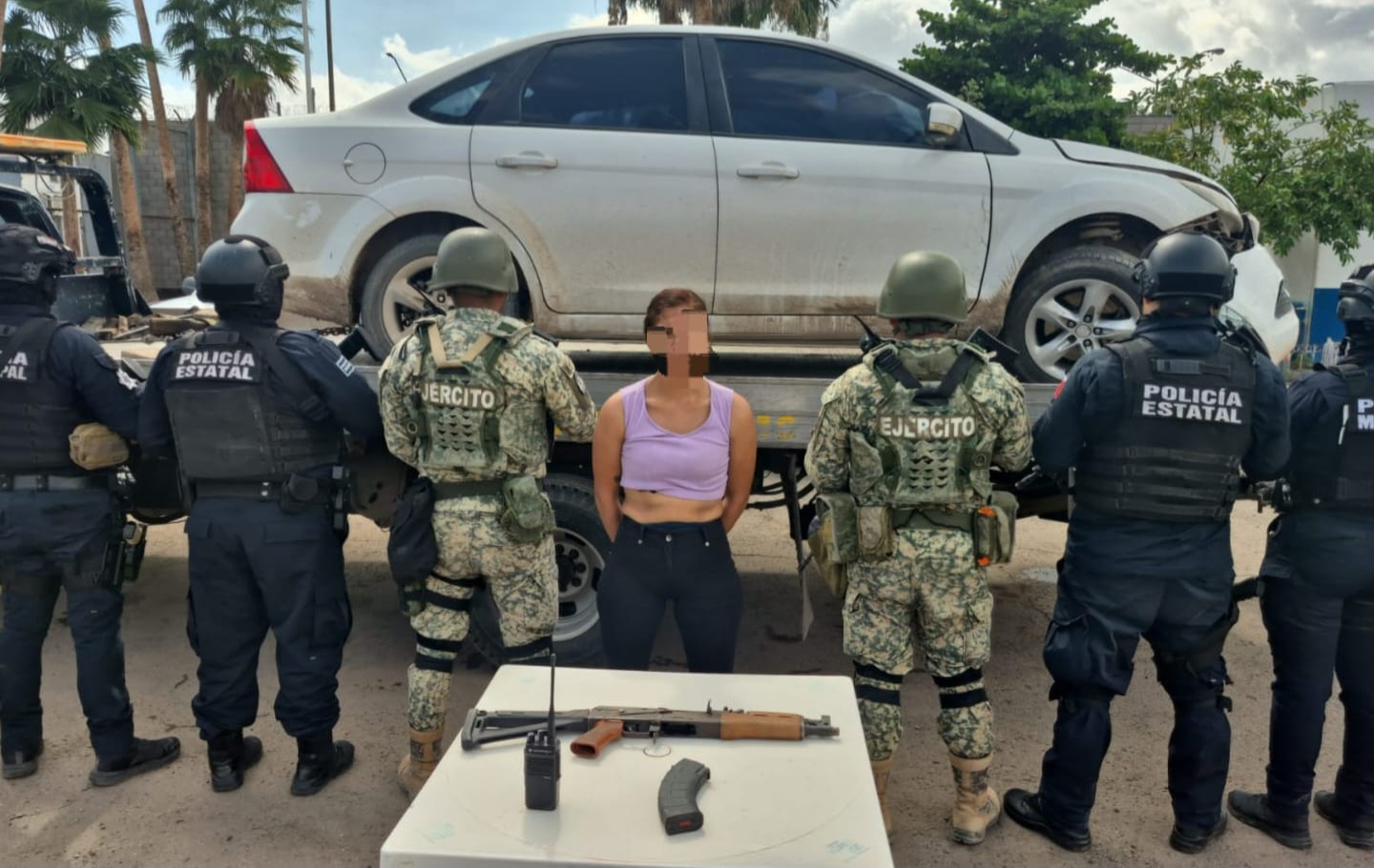 Se detuvo a la mujer que viajaba en el auto, y junto con un arma larga tipo AK 47 y un radio de comunicación, fueron asegurados y puestos a disposición del Ministerio Público de la Fiscalía General del Estado para que realice las investigaciones correspondientes.