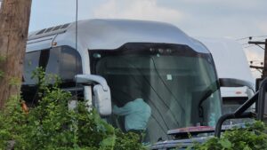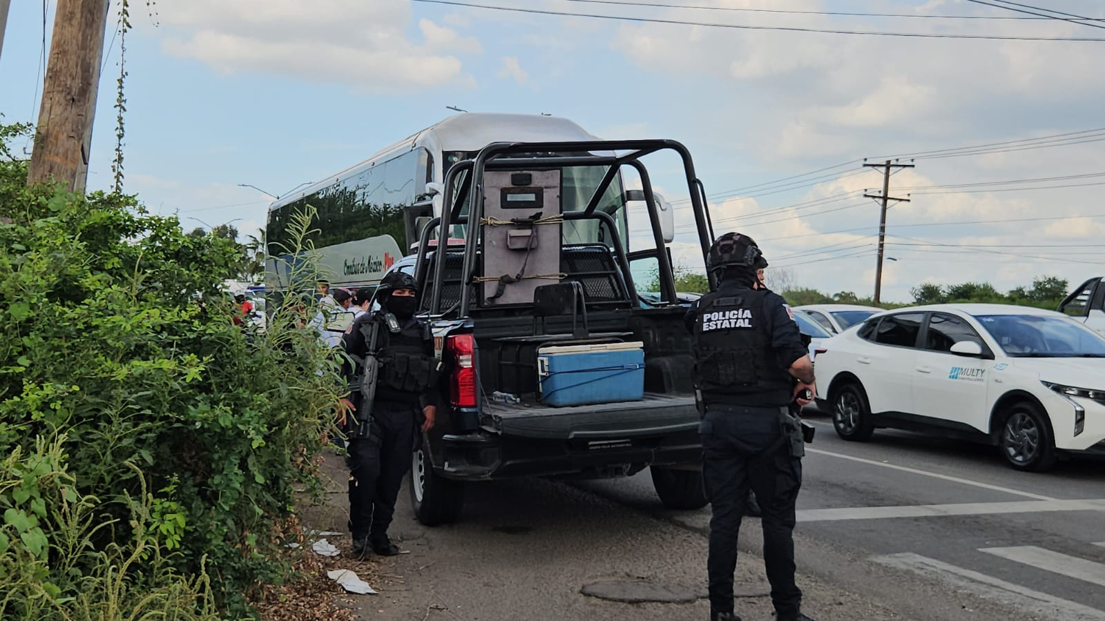 Durante la balacera un camión de la empresa Ómnibus de México Plus, color gris con azul, resultó con dos impactos de balas en el cristal delantero, pero al parecer no resultó lesionado ningún pasajeros.