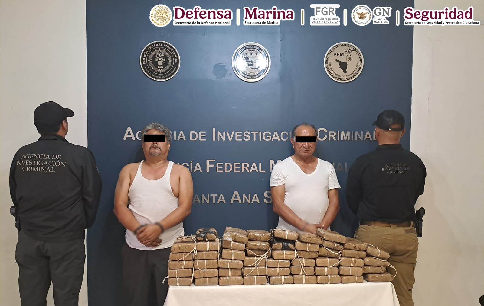 Hermosillo, Sonora; a 23 de septiembre de 2025.- Resultado de labores de seguridad, inspección y vigilancia en carreteras del país para impedir el traslado de sustancias ilícitas, en una acción encabezada por elementos de la Agencia de Investigación Criminal (AIC) de la Fiscalía General de la República, junto con Secretaría de la Defensa Nacional (Defensa), Secretaría de Marina (Semar), Guardia Nacional (GN) y Secretaría de Seguridad y Protección Ciudadana (SSPC), fueron detenidos dos sujetos que transportaban cerca de 50 kilos de heroína en un autobús de pasajeros en Sonora.