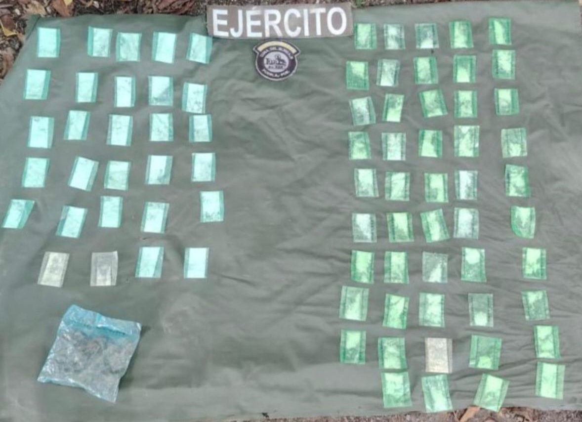 Al realizar reconocimientos terrestres en la colonia Ferrocarrilera, el personal militar localizó una bolsa con 49 dosis de cristal, 29 dosis de cocaína y una dosis de marihuana.