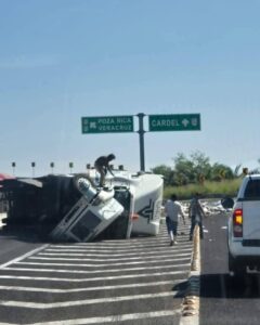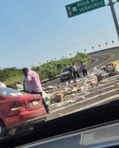 Veracruz, Veracruz, a 18 de octubre de 2025.- Un trailer que transportaba miles de despensas, con dirección a la zona norte de la entidad veracruzana, se volcó esta mañana y los automovilistas que circulaban por la misma carretera realizaron rapiña y se llevaron casi toda la ayuda para los afectados.