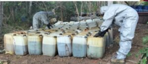 Culiacán, Sinaloa; a 24 de octubre de 2025.- Personal del Ejército Mexicano, en coordinación con la Guardia Nacional, la Secretaría de Marina, la Secretaría de Seguridad y Protección Ciudadana, la Fiscalía General de la República, la Fiscalía General del Estado y la Secretaría de Seguridad Pública de Sinaloa, a través de la Policía Estatal Preventiva, aseguraron y deshabilitaron un área de almacenamiento de precursores químicos en el área rural de la capital del estado.