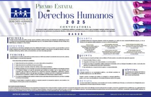 Culiacán, Sinaloa; a 28 de octubre del 2025.- La Comisión Estatal de los Derechos Humanos de Sinaloa (CEDH) da a conocer la Convocatoria para el Premio Estatal de Derechos Humanos 2025, dirigida a organizaciones de la sociedad civil, instituciones académicas, agrupaciones de defensores y defensoras de derechos humanos, y a la sociedad en general, para proponer a personas o instituciones que se hayan destacado en actividades de promoción efectiva y defensa de los derechos humanos en el estado de Sinaloa.
