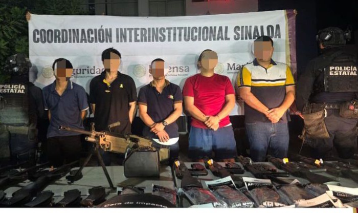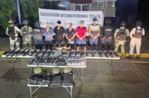 Culiacán, Sinaloa, a 06 de noviembre de 2025.- Elementos de la Secretaría de Seguridad Pública de Sinaloa, a través de la Policía Estatal Preventiva, en coordinación con el Ejército Mexicano, la Guardia Nacional, la Secretaría de Marina, la Secretaría de Seguridad y Protección Ciudadana, la Fiscalía General de la República y la Fiscalía General del Estado, lograron la detención de hombres armados, así como la incautación de explosivos, vehículos y otros objetos de delito en el sector norte de la ciudad capital.