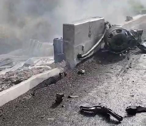 Eldorado, Sinaloa; a 08 de noviembre de 2025.- Un trailer que transportaba tablaroca sobre la Maxipista a la altura del ejido Tres Gotas de Agua se volcó para luego incendiaron totalmente. El conductor de forma milagrosa resultó ilesos.