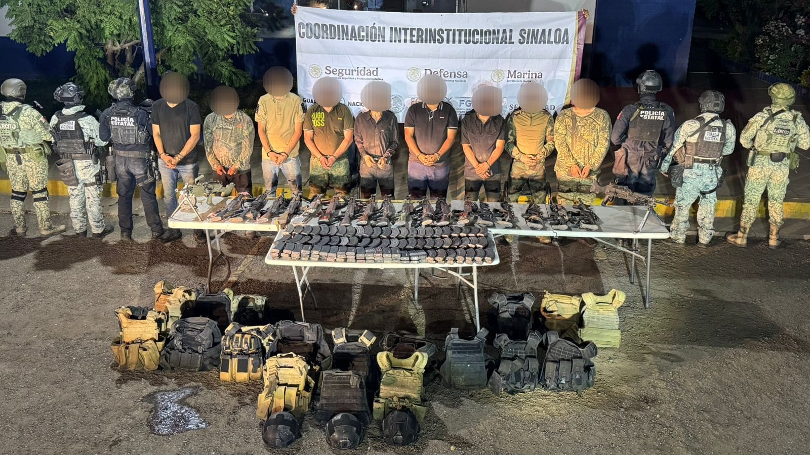 Culiacán, Sinaloa; a 15 de noviembre de 2025.- Personal de la Secretaría de Seguridad Pública del Estado, a través del Grupo de Operaciones Especiales Sinaloa (GOES) de la Policía Estatal Preventiva y del Ejército Mexicano, en coordinación con la Guardia Nacional, la Secretaría de Marina, la Secretaría de Seguridad y Protección Ciudadana, la Fiscalía General de la República y la Fiscalía General del Estado, realizó un operativo terrestre y aéreo tras la denuncia ciudadana de un enfrentamiento en el poblado El Guasimal, donde aseguraron a 9 civiles, armas largas, cargadores, cartuchos, chalecos y vehículos.