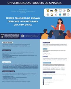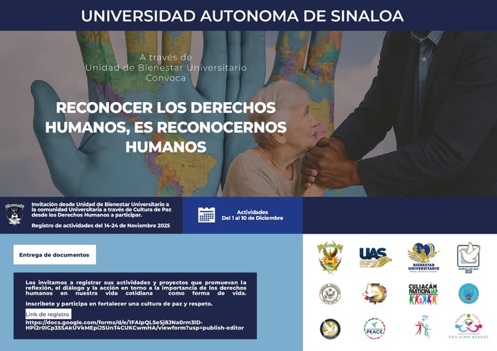 Culiacán, Sinaloa; a 22 de noviembre de 2025.- En el marco del Día Internacional de los Derechos Humanos (DDHH), la Universidad Autónoma de Sinaloa (UAS), a través de la Unidad de Bienestar Universitario (UBU), lanzó la convocatoria al Tercer Concurso de Ensayos “Derechos Humanos para una vida digna” e invitó a participar en la campaña “Reconocer los Derechos Humanos, es reconocernos humanos” con propuestas de actividades y proyectos.
