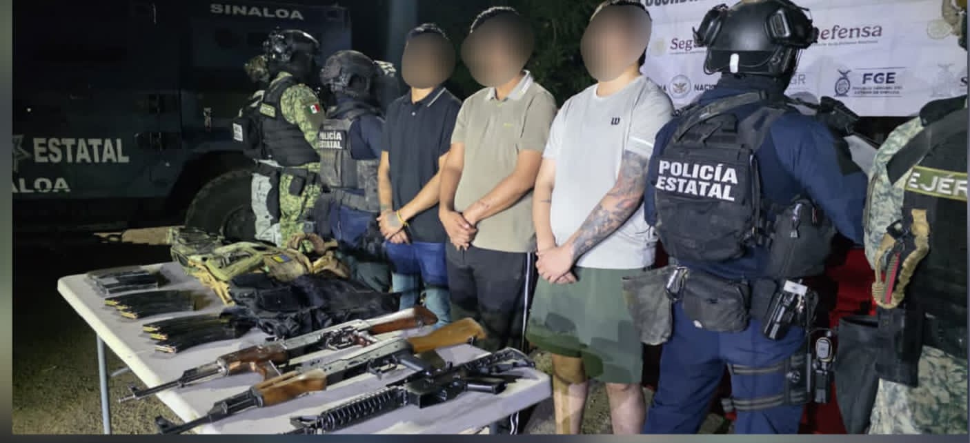 Culiacán, Sinaloa, a 27 de noviembre de 2025.- Elementos de la Secretaría de Seguridad Pública de Sinaloa, a través del Grupo de Operaciones Especiales Sinaloa (GOES) de la Policía Estatal Preventiva y de la Guardia Nacional, en coordinación con el Ejército Mexicano, la Secretaría de Marina, la Secretaría de Seguridad y Protección Ciudadana, la Fiscalía General de la República y la Fiscalía General del Estado, detuvieron a 3 civiles y aseguraron armas largas, cargadores y municiones.