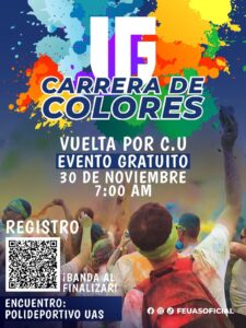 Culiacán, Sinaloa; a 27 de noviembre de 2025.- La Federación de Estudiantes de la Universidad Autónoma de Sinaloa (FEUAS) invita a la comunidad universitaria a participar en la Carrera de Colores, que se realizará el próximo domingo 30 de noviembre, a las 7:00 de la mañana, teniendo como punto de encuentro el estacionamiento de la Facultad de Ingeniería en Ciudad Universitaria.