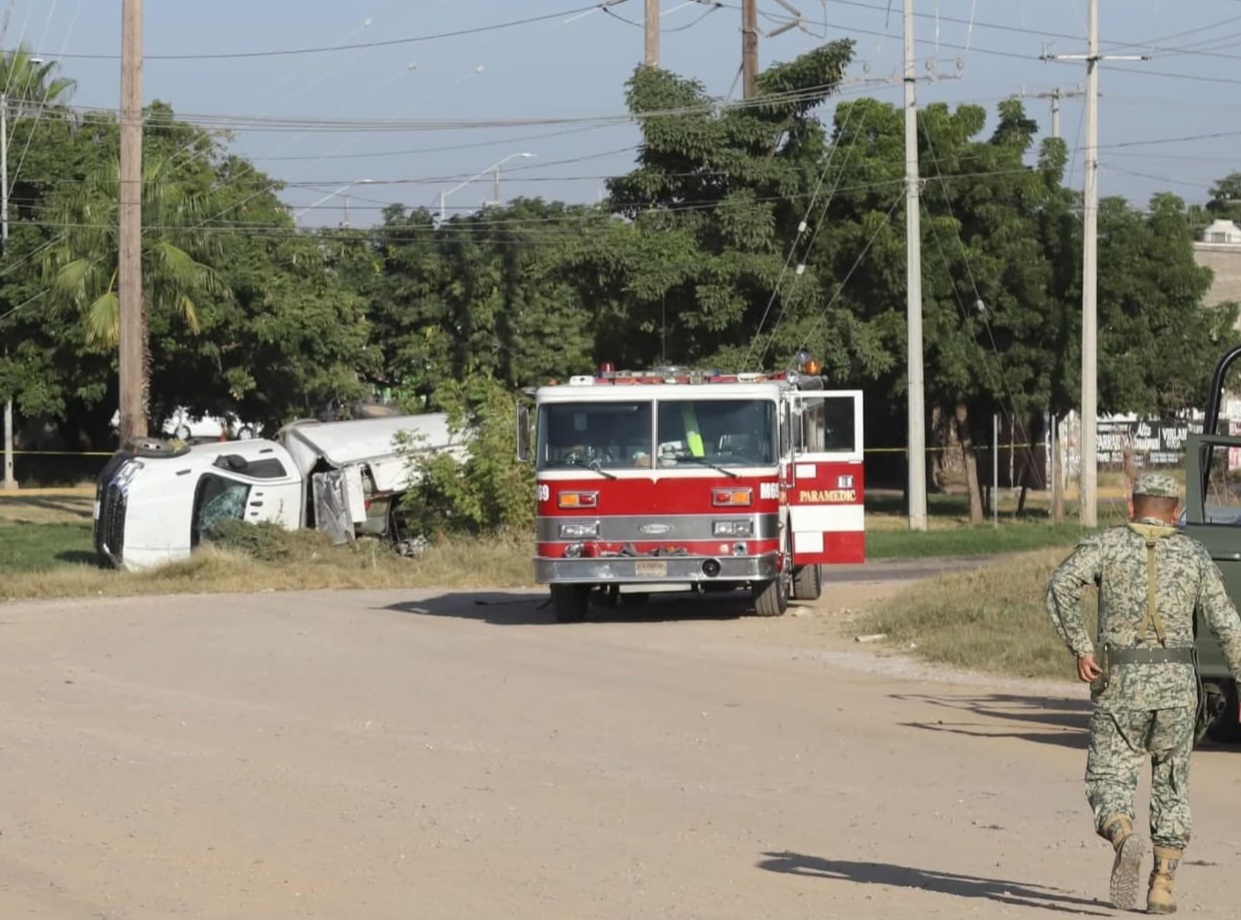Mazatlán, Sinaloa.- Una camioneta de color blanco con redilas, es la que transportaba contenedores con capacidad para mil litros, la cual, sufre un accidente tipo volcadura en una glorieta del lugar.