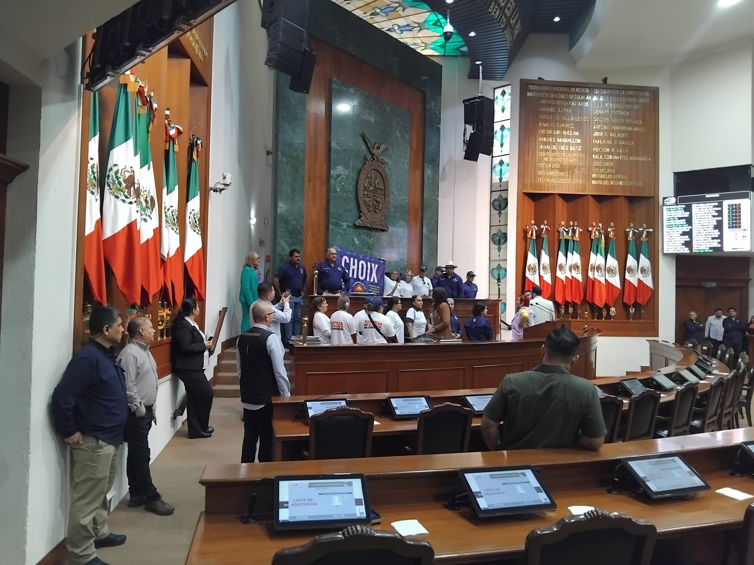Culiacán, Sinaloa; a 16 de diciembre de 2025.- Integrantes del colectivo Guerreros Azules A. C., encabezados por Yesenia Rojo Carrizosa, irrumpieron de manera pacífica en la tribuna del Congreso del Estado de Sinaloa para demandar el pago de pensiones a diez viudas de policías municipales de Choix, cuyos derechos, aseguraron, han sido ignorados por el gobierno local.