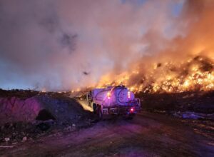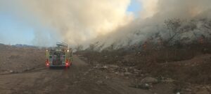 Culiacán, Sinaloa; a 19 de diciembre de 2025.– Elementos del cuerpo de Bomberos y Protección Civil combaten, desde la noche de ayer, un incendio de grandes dimensiones en el relleno sanitario municipal, ubicado en la colonia Lomas de Rodriguera.