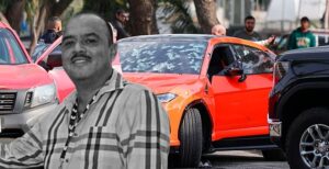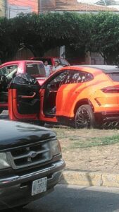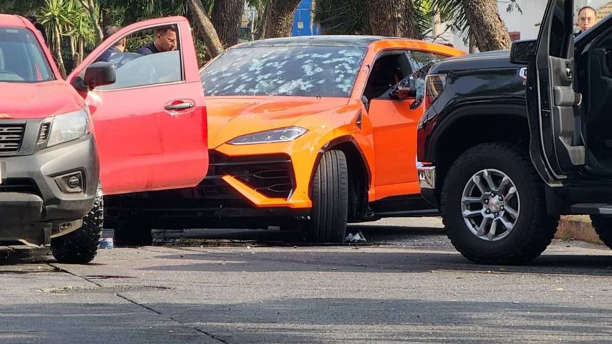 Diversos videos en redes sociales muestran el momento en el que hombres armados disparan durante alrededor de 15 minutos contra una camioneta Lamborghini Urus color naranja, dejando la parte frontal completamente perforada por las balas.