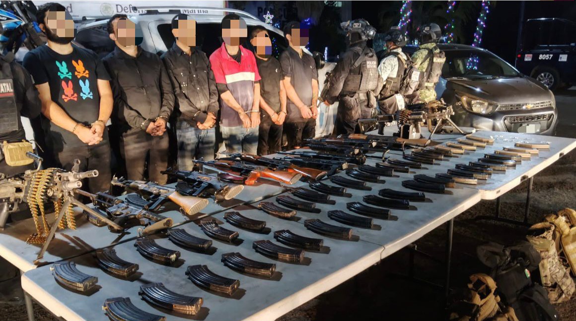 Navolato, Sinaloa, a 30 de diciembre de 2025.- Personal de la Secretaría de Seguridad Pública de Sinaloa, a través del Grupo de Operaciones Especiales Sinaloa (GOES) de la Policía Estatal Preventiva, en coordinación con el Ejército Mexicano, la Guardia Nacional, la Secretaría de Marina, la Fiscalía General de la República, la Secretaría de Seguridad y Protección Ciudadana y la Fiscalía General del Estado, detuvo a seis civiles y aseguró diverso armamento y vehículos en Navolato tras una agresión.