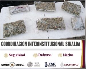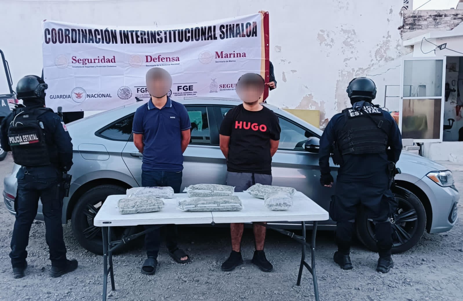 Elementos de la Secretaría de Seguridad Pública de Sinaloa, a través del Grupo de Operaciones Especiales Sinaloa (GOES) de la Policía Estatal Preventiva, en coordinación con el Ejército Mexicano, la Guardia Nacional, la Secretaría de Marina, la Fiscalía General de la República, la Secretaría de Seguridad y Protección Ciudadana y la Fiscalía General del Estado, detuvieron a dos civiles y aseguraron paquetes de presunta droga, así como un vehículo.