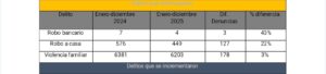 Entre los delitos que disminuyeron se encuentran el robo a casa habitación, con una baja del 22%; el robo bancario, que cayó 43%; y la violencia familiar, con una reducción marginal del 3%. Si bien estas disminuciones ofrecen señales puntuales de mejora, su impacto es limitado frente al crecimiento generalizado de la criminalidad.