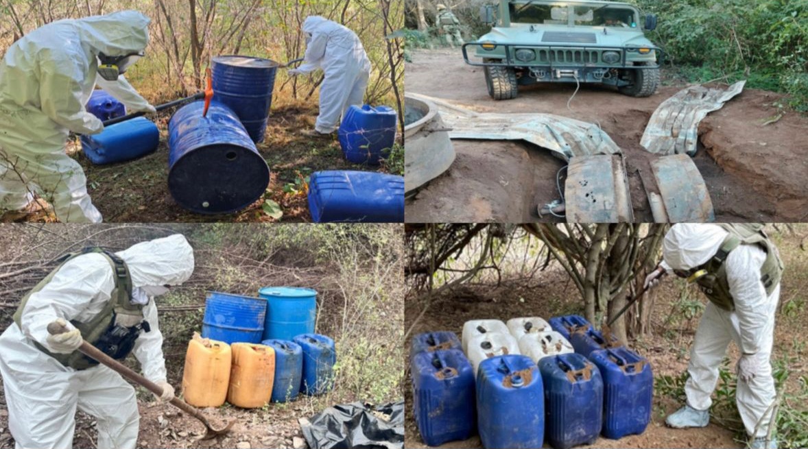 En el marco de la operación “Búsqueda, Localización y Destrucción de Laboratorios Clandestinos,” personal militar llevó a cabo reconocimientos terrestres en zonas rurales de los municipios antes mencionados, donde se detectaron áreas utilizadas para el almacenamiento de sustancias químicas, en las que se aseguró lo siguiente: