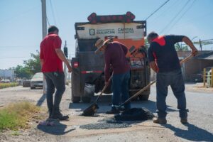 Indicó que actualmente las cuadrillas realizan labores tanto en bulevares principales como en diversas colonias, entre ellas Progreso y San Isidro, además de otros sectores que presentan mayor afectación en su carpeta asfáltica.