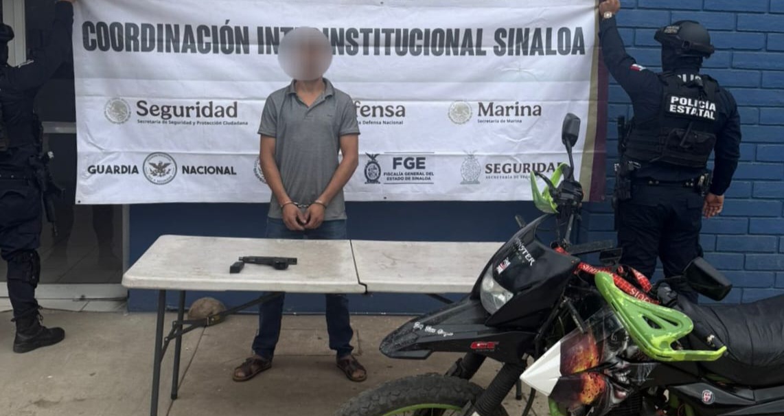 Culiacán, Sinaloa, a 08 de febrero de 2026.- Personal de la Secretaría de Seguridad Pública del Estado, a través de la Policía Estatal Preventiva, en coordinación con el Ejército Mexicano, la Guardia Nacional, la Secretaría de Marina, la Secretaría de Seguridad y Protección Ciudadana, la Fiscalía General de la República y la Fiscalía General del Estado, aseguró, en el municipio de Culiacán, a una persona que portaba un arma corta y se trasladaba a bordo de una motocicleta sin placas.