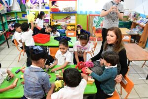 Finalmente, la comitiva visitó el Jardín de Niños “Josefa Ortiz de Domínguez”, donde junto a la Subsecretaria de Educación Básica, Dra. Silvia Evelyn Ward Bringas, y la Coordinadora Académica de este nivel educativo, Mtra. Elizabeth Cano Félix, la Secretaria agradeció al personal del Sistema DIF Estatal por su invaluable apoyo en la entrega de desayunos escolares. En el sitio, las autoridades participaron en dinámicas de gestión de emociones, donde los infantes expresaron su sentir a través de dibujos, fomentando un ambiente de escucha activa y bienestar integral desde la primera infancia.