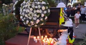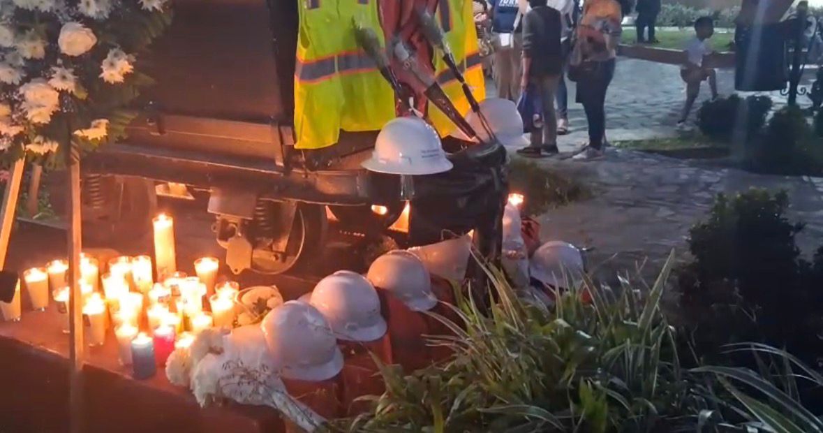 Frente al monumento dedicado a los mineros, ubicado a un costado del templo de San Sebastián, los asistentes colocaron veladoras, flores y cascos de seguridad sobre el vagón minero que forma parte del memorial. Vestidos de blanco, permanecieron en oración durante más de una hora, en un gesto colectivo de duelo y solidaridad.