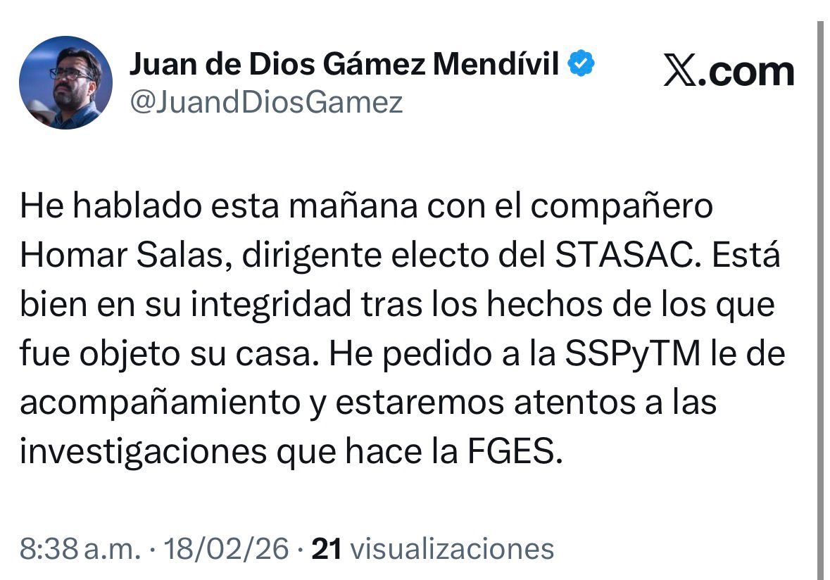 “He hablado esta mañana con el compañero Homar Salas, dirigente electo del STASAC. Está bien en su integridad tras los hechos de los que fue objeto su casa” dijo.