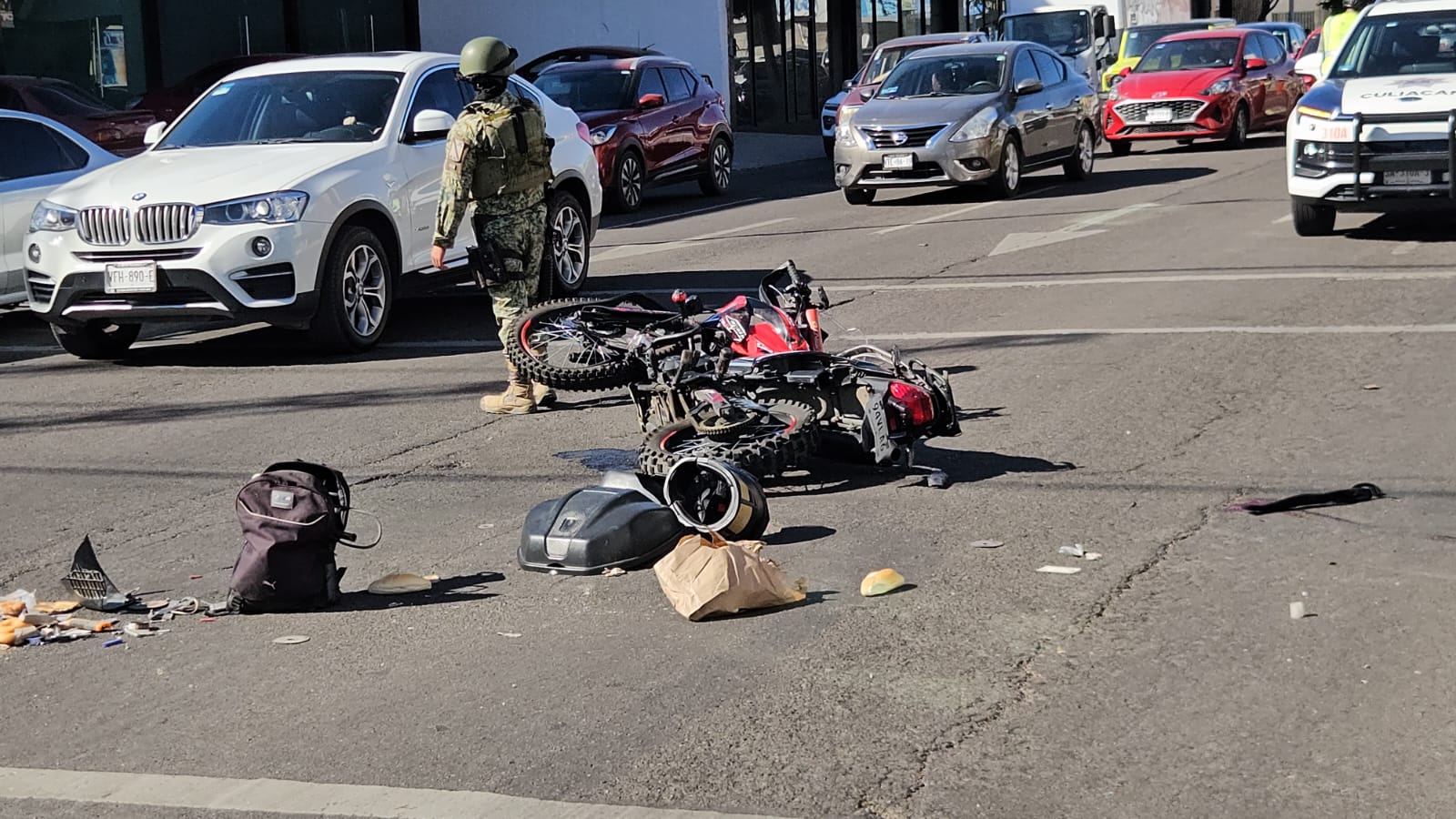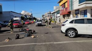 Culiacán, Sinaloa; a 21 de febrero de 2026.- Un motociclista que hasta el momento se encuentra en calidad de desconocido resultó gravemente lesionado tras un choque ocurrido este sábado a las 3 de la tarde en el cruce de la avenida Álvaro Obregón y la calle Río Mocorito, en la colonia Guadalupe de esta ciudad.