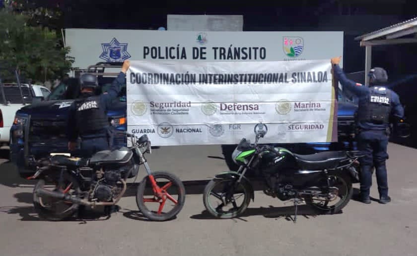 Después de un reporte al 9-1-1 sobre disparos de arma de fuego en la sindicatura de Villa Juárez, en Navolato, la Base de Operaciones Interinstitucional desplegó, de inmediato, un operativo de búsqueda de los presuntos responsables, localizando dos motocicletas marca Italika, recién abandonadas en distintos puntos. Al acercarse a verificar, se percataron de que no contaban con placas legibles ni números de serie visibles, por lo que fueron aseguradas y puestas a disposición del Ministerio Público correspondiente, para que lleve a cabo las investigaciones que marca la ley.