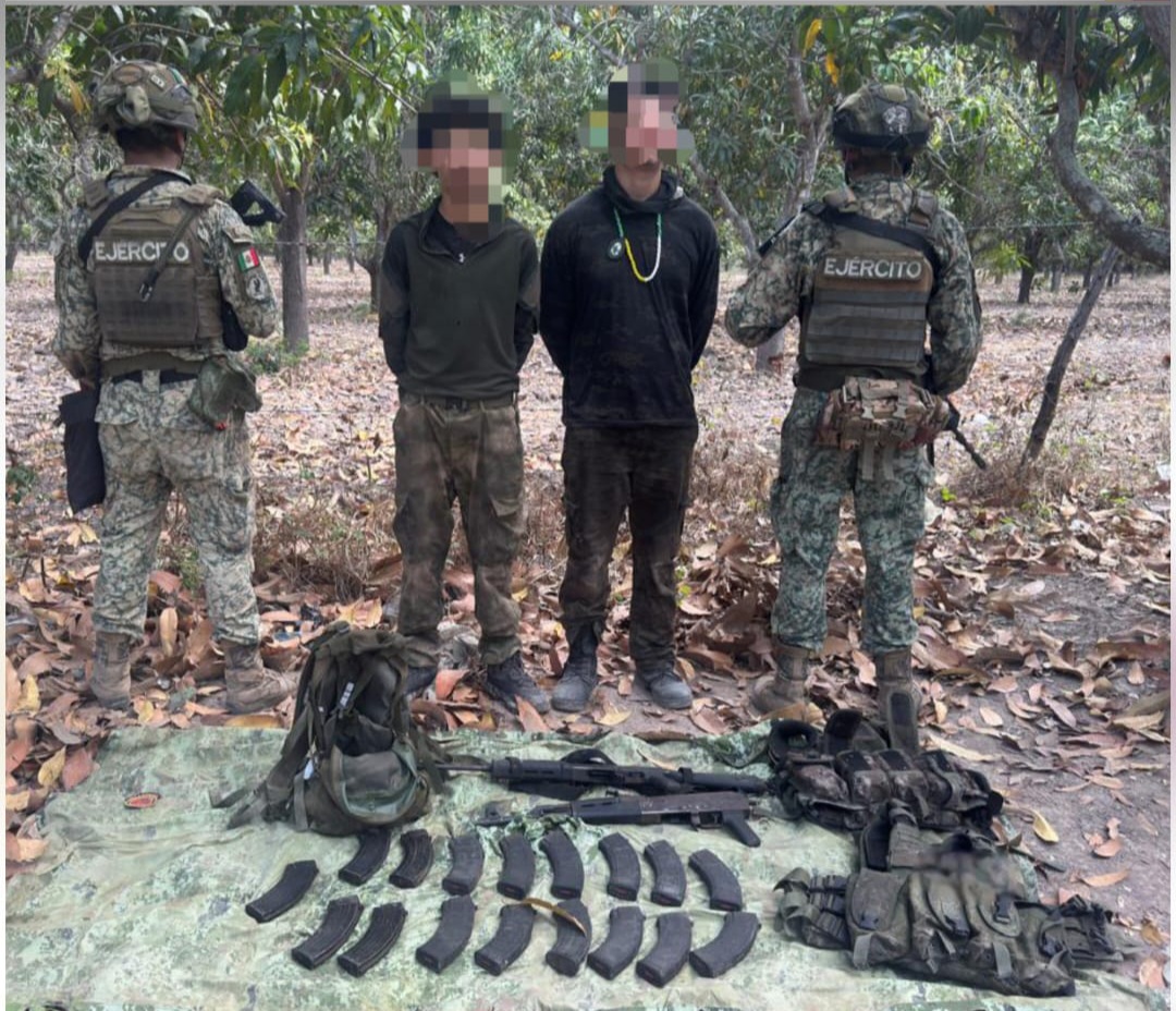 Fue durante reconocimientos terrestres en la cabecera municipal que el personal militar se percató de dos civiles que vestían ropa y chalecos tácticos, además de portar armas largas; estos, al darse cuenta de la presencia de las autoridades, intentaron huir, pero fueron detenidos por los elementos castrenses.