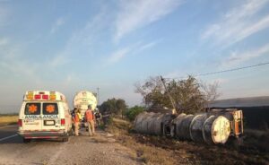 Culiacán, Sinaloa; a 07 de marzo de 2026.- Un accidente de carretera tipo salida de camino y volcadura de un remolque cisterna cargado con combustible movilizó a los cuerpos de emergencia y autoridades federales durante la mañana de este sábado sobre la Maxipista Culiacán-Mazatlán, a la altura del ejido Lazareto, perteneciente a la sindicatura de Costa Rica.