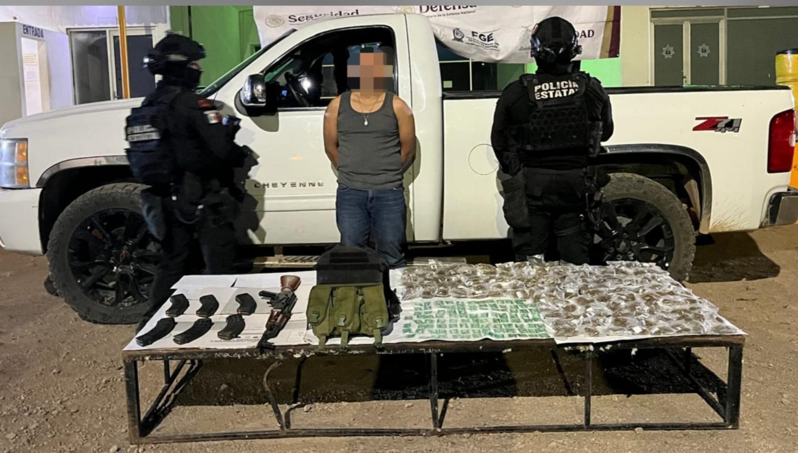 Rosario, Sinaloa, a 19 de marzo de 2026.- Elementos de la Policía Estatal Preventiva, a través del Grupo de Operaciones Especiales de Sinaloa (GOES), en coordinación con el Ejército Mexicano, la Guardia Nacional, la Secretaría de Marina, la Secretaría de Seguridad y Protección Ciudadana, la Fiscalía General de la República y la Fiscalía General del Estado, detuvieron a un civil con un fusil, cargadores, cartuchos, un chaleco y un vehículo con reporte de robo en el municipio de Rosario.