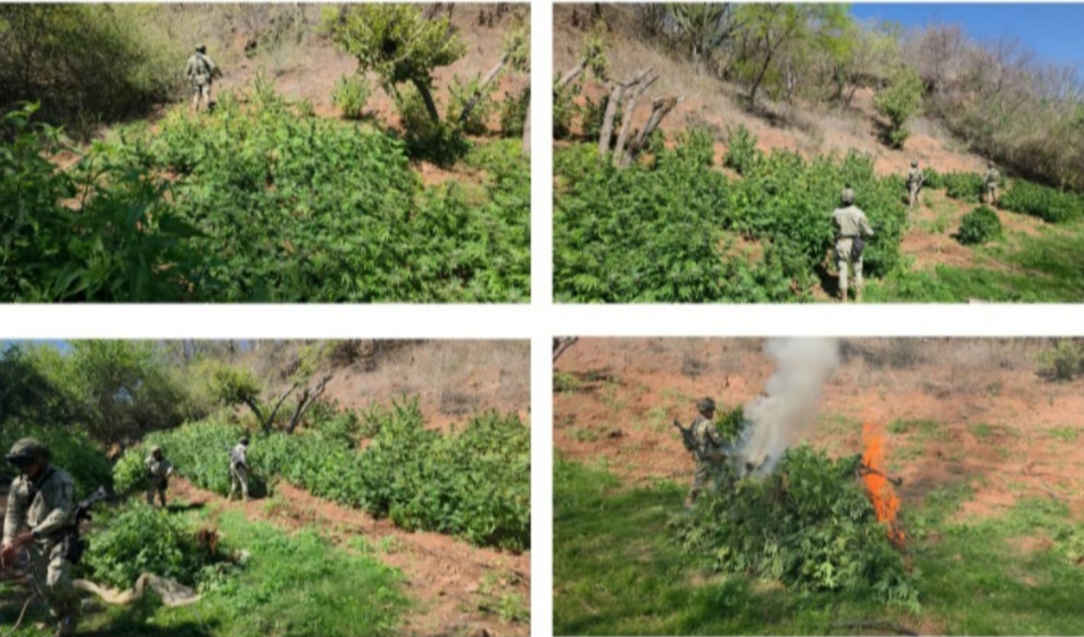 Badiraguato, Sinaloa, 19 de marzo de 2026.- Elementos del Ejército Mexicano, en coordinación con la Guardia Nacional, la Secretaría de Marina, la Secretaría de Seguridad y Protección Ciudadana, la Fiscalía General de la República, la Fiscalía General del Estado y la Secretaría de Seguridad Pública de Sinaloa, a través de la Policía Estatal Preventiva, ubicaron tres plantíos de marihuana en el municipio de Badiraguato.